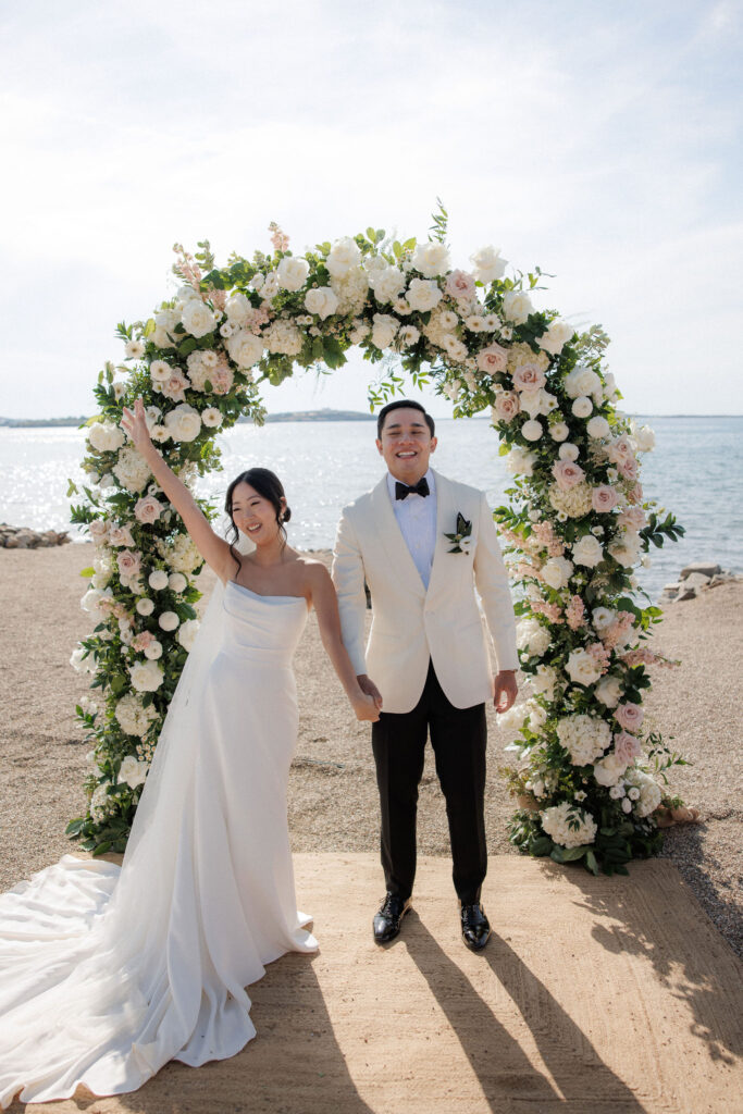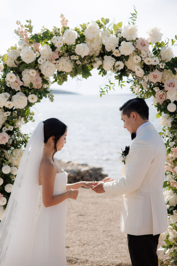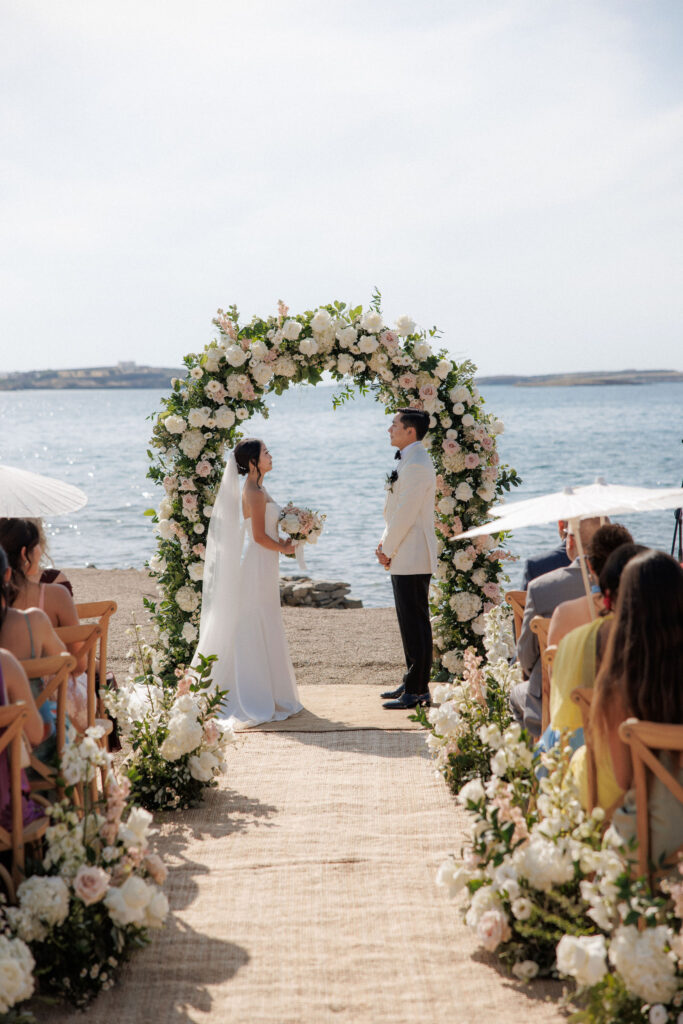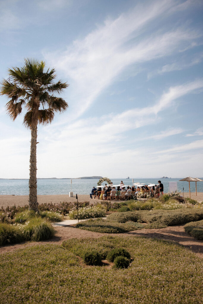 Set on a secluded stretch of sand, the ceremony embraced the natural beauty of the Cycladic landscape. With the Aegean Sea as a backdrop, Liz and Gabe exchanged vows under a lush floral arch, surrounded by their closest family and friends.