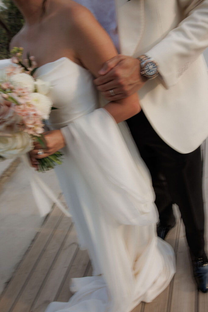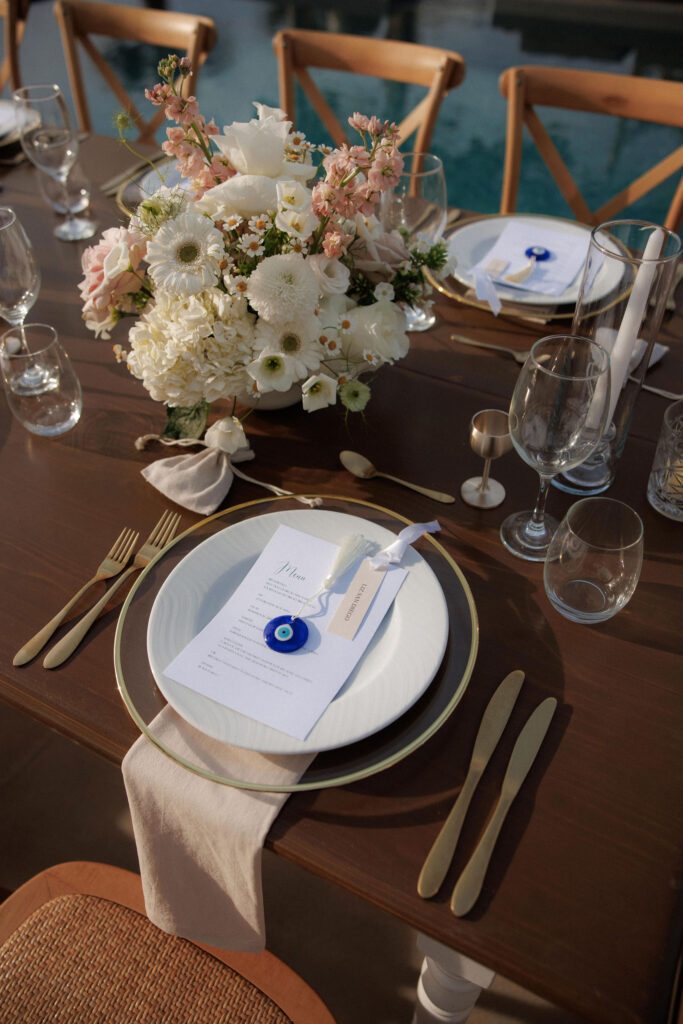Every detail was curated to reflect refined wedding styling— a candlelit dinner featuring local Greek cuisine and wines from nearby vineyards. The soft blush and ivory palette complemented the golden hour light, creating a truly romantic atmosphere.